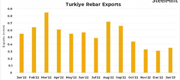 • Turkiye’s rebars exports volumes increased by 13.6% m-o-m in Jan’23 to 351,020 t from 308,980 t in Dec’22, as per data recently released by Customs.
