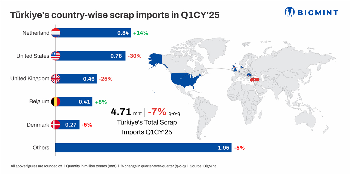 - The Netherlands was the leading scrap exporter to Turkiye in Q1CY’25. Shipments increased by 14% q-o-q to 0.84 million tonnes (mnt).