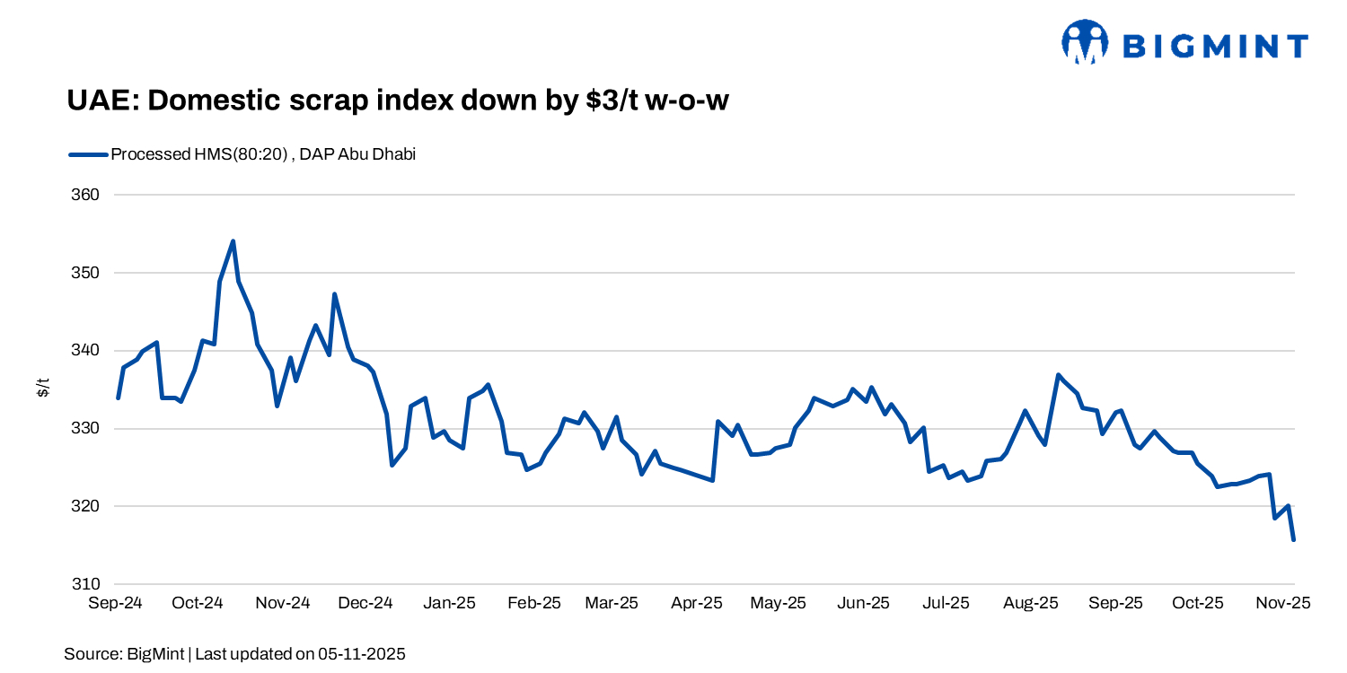 BigMint’s index for the UAE’s domestic processed heavy melting scrap (HMS) dropped by AED 10/t ($3/t) w-o-w to AED 1,160/t ($316/t). The UAE market is facing regional oversupply, yet export offers remain largely stable versus last week. Middle East-origin shredded and PNS-HMS mix are quoted at $360-365/t and $340-345/t CFR Qasim, respectively.