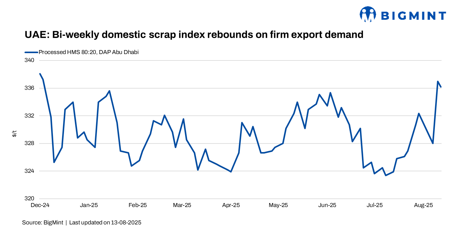 BigMint’s UAE domestic processed HMS index rebounded by AED 30/tonne (t) ($8/t) w-o-w to AED 1,235/t ($336/t), driven by rising export demand and despite limited purchases from key mills.