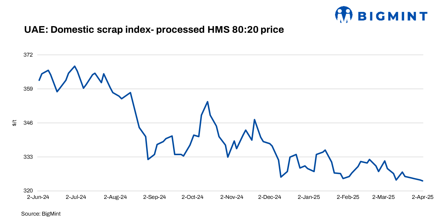 BigMint’s domestic processed HMS index edged down by AED 3/t ($1/t) w-o-w to AED 1,190/t ($324/t).