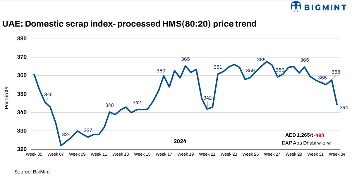 BigMint’s bi-weekly assessment revealed a significant drop in HMS (80:20) processed scrap prices, which fell to AED 1,260/t ($344/t), DAP Abu Dhabi, from AED 1,314/t ($357/t) in the previous week.