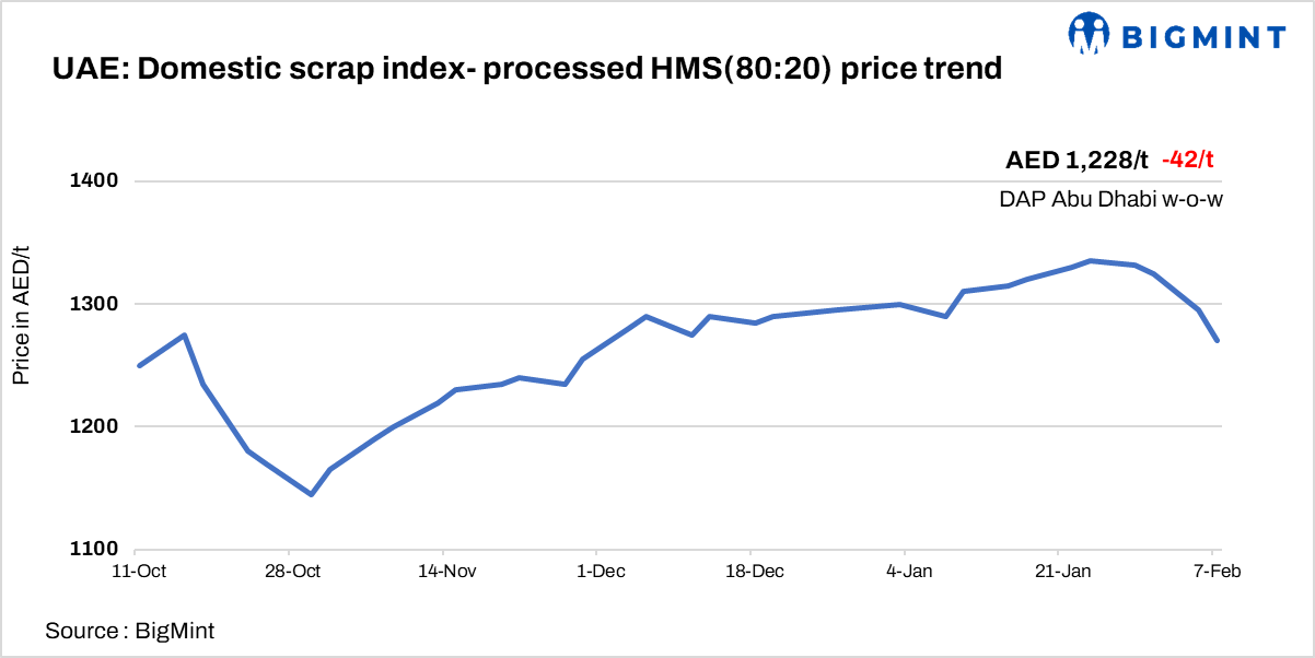 In BigMint’s Week 7 market survey, sluggish activities were observed, with a nominal volume of approximately 3,000-4,000 t of mixed scrap grades priced at AED 1,200-1,380/t, covering HMS processed and shredded scrap on a DAP Abu Dhabi basis.