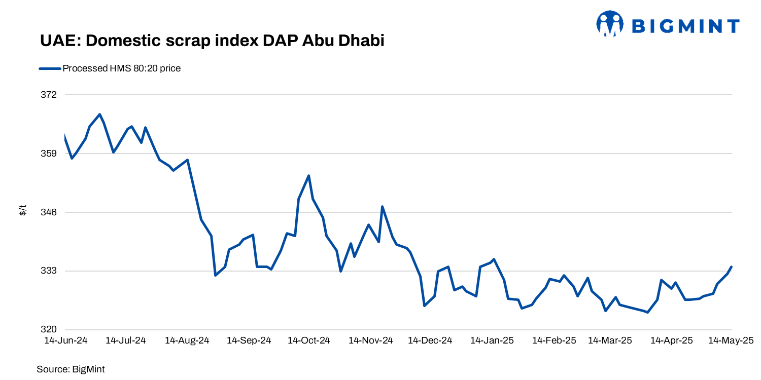 BigMint’s UAE domestic processed HMS index inched up by AED 14/t ($4/t) w-o-w to AED 1,227/t ($334/t), with extreme heat during April and May – the hottest months on record in the UAE – slowing scrap collection and, consequently, tightening supply and pushing up domestic scrap prices.