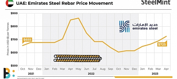 Emirates Steel, one of the leading steel producers in the UAE, has increased rebars offers by $35/t (AED 128/t) m-o-m for Apr’23 deliveries, sources informed. Revised offers stand at $725/t exw (AED 2,663/t) compared to $665/t (AED 2,534/t) last month. The recovery in global steel and raw material prices has supported the price hike, SteelMint noted.