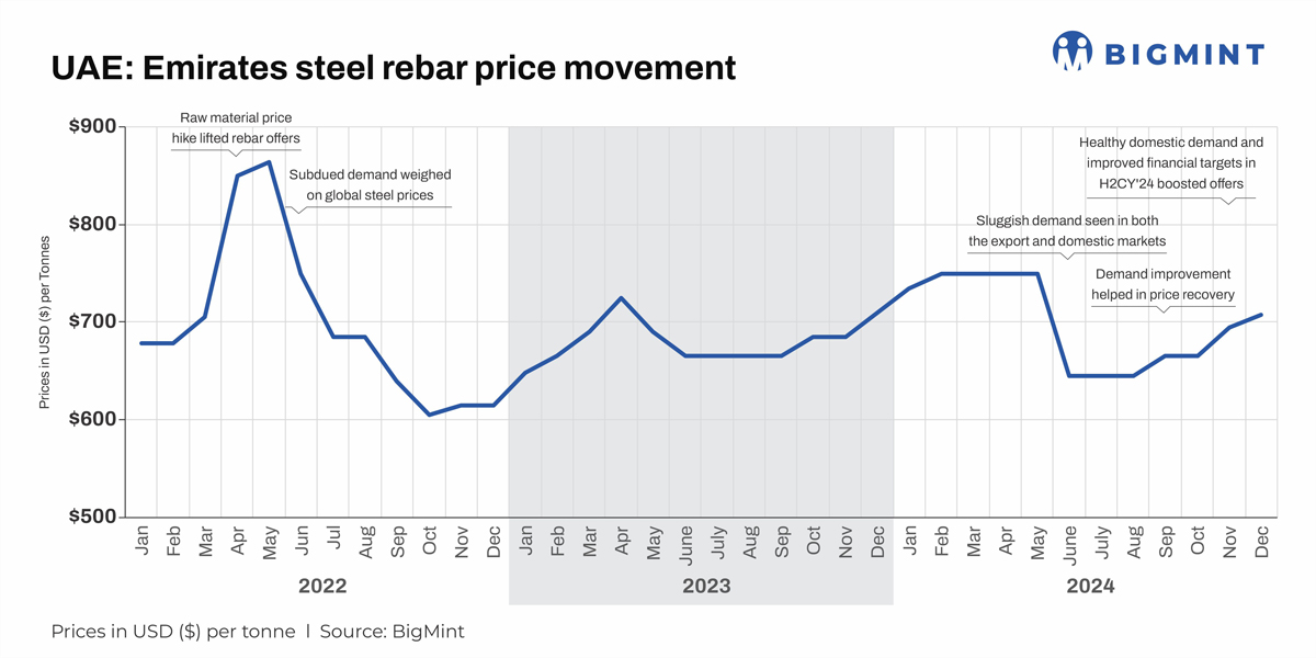 Emirates Steel, one of the leading steel producers in the UAE, has increased rebar offers by around $14/t (AED 50/t) m-o-m for its Dec’24 deliveries. Revised prices are at $709/t (AED 2,602/t) exw compared to $695/t (AED 2,553/t) exw last month, sources informed. The company decided to raise offers amid healthy domestic demand and improved financial targets in H2CY’24, BigMint has learnt.