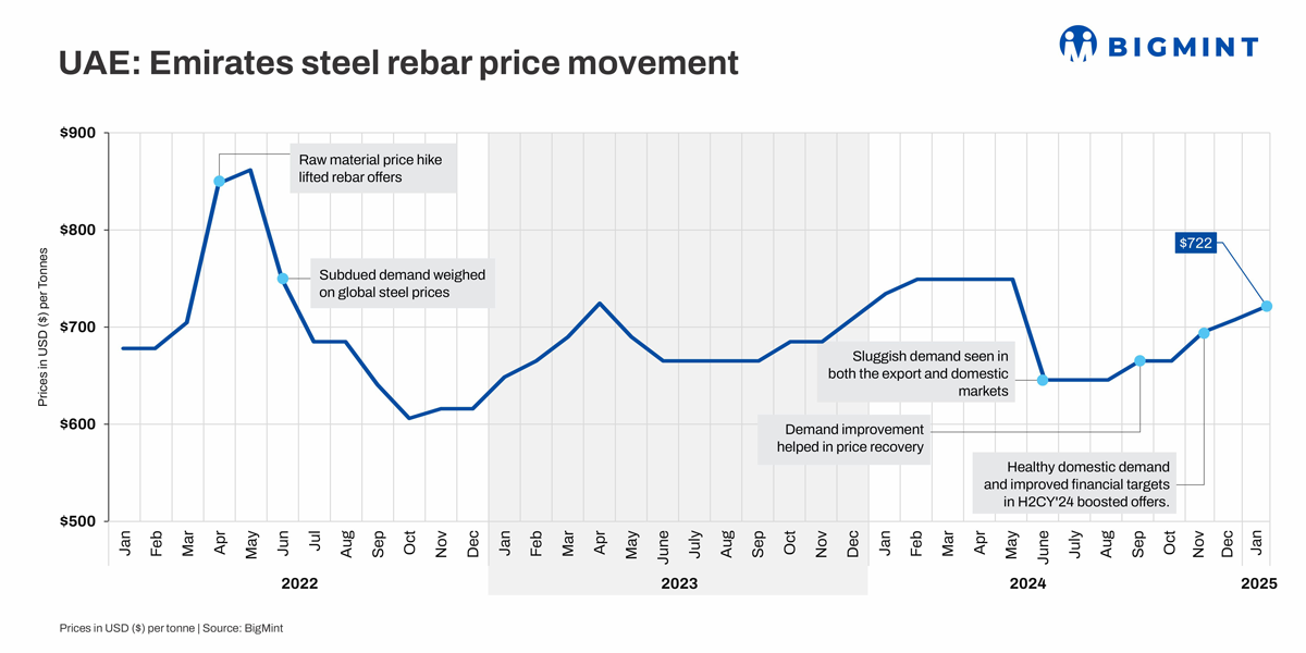 Emirates Steel, one of the leading steel producers in the UAE, has increased rebar offers by around $14/t (AED 50/t) m-o-m for its Jan’25 deliveries. Revised prices are at $722/t (AED 2,652/t) exw compared to $708/t (AED 2,602/t) exw last month, sources informed. The decision comes amid healthy domestic demand, supportive raw materials sentiments, and improved financial targets in H2CY’24, BigMint has learnt.