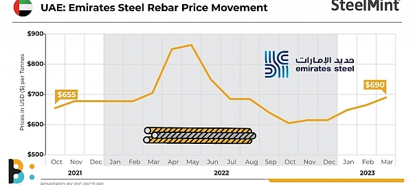 Emirates Steel, one of the leading steel producers in the UAE, has increased rebar offers by $25/t (AED 92/t) m-o-m for Mar’23 deliveries, sources informed. Revised offers stand at $690/t exw (AED 2,534/t) compared to $665/t (AED 2,442/t) last month. Improvement in steel demand in the region has supported the price hike, SteelMint noted.
