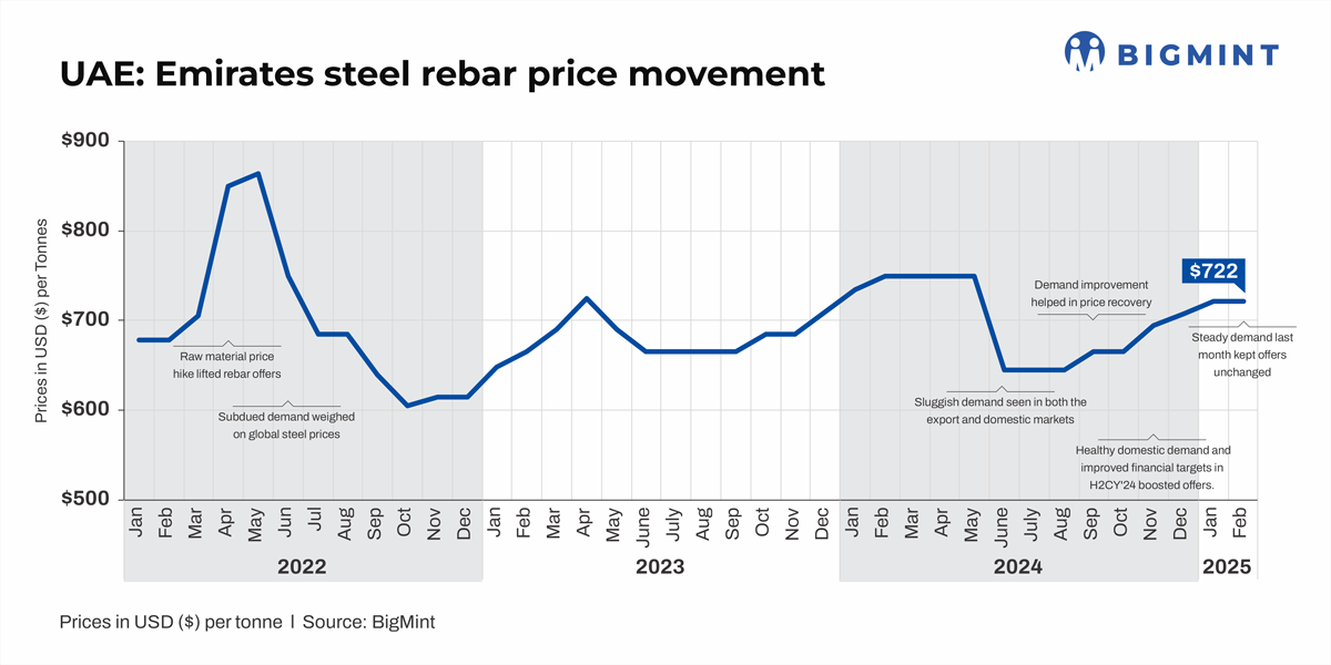 Emirates Steel has rolled over its rebar offers for Feb’25 deliveries, sources informed BigMint. Post-revision, offers stood at around $722/t exw (AED 2,652/t). The company opted to maintain stable offers due to steady demand over the past month.