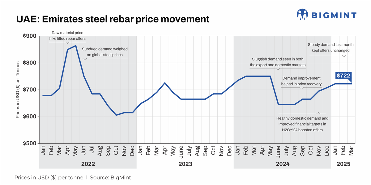 Emirates Steel has rolled over its rebar offers for Mar’25 deliveries, sources informed BigMint. Post-revision, offers stood unchanged m-o-m at around $722/t (AED 2,652/t) exw-Abu Dhabi. The company decided to keep its offers steady, taking into account the approaching Ramadan period, during which demand tends to be slow due to a downturn in construction activity.