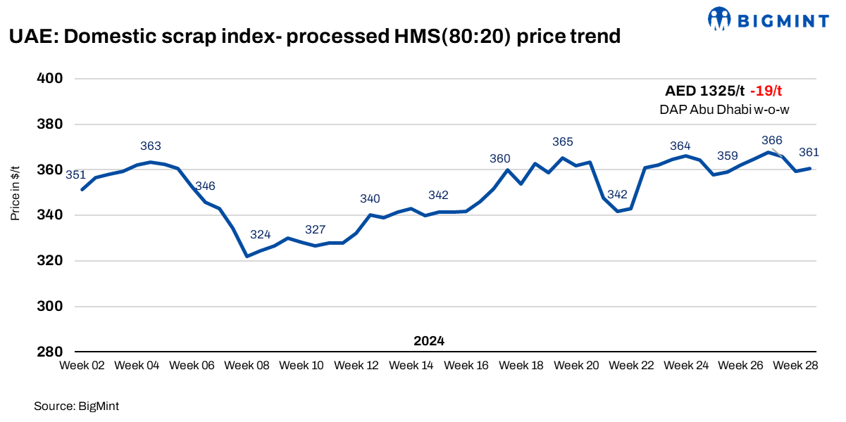 BigMint’s market survey for week 28 witnessed bookings of 7,000-8,000 tonnes (t) of ferrous scrap. These included 4,000-5,000 t of HMS (80:20) processed in the range of AED 1,340-1,350/t, and around 3,000 t of shredded at AED 1,460-1470/t DAP Abu Dhabi.