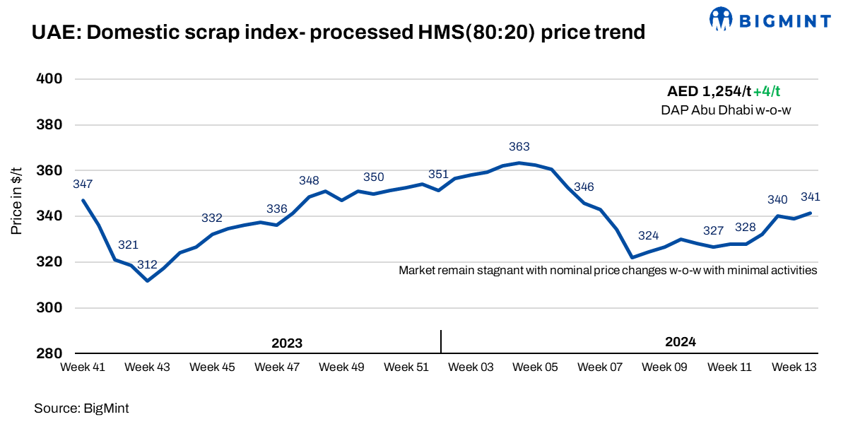 BigMint’s bi-weekly assessment showed an AED 4/t ($1/t) rise for HMS (80:20) processed scrap grade, maintaining a price range of AED 1,254/t ($341/t) DAP.