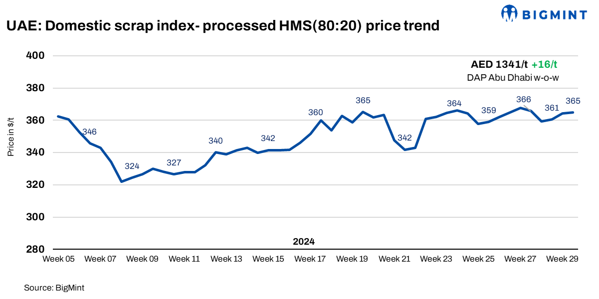 BigMint’s bi-weekly assessment shows an increase of AED 16/t ($4/t) for HMS (80:20) processed, with prices in a range of AED 1,339-1,341/t ($364-365/t) DAP Abu Dhabi.