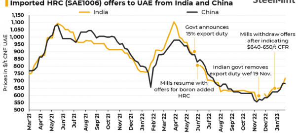 A private Indian steel mill was heard offering HRCs at around $720/t CFR UAE this week. This is higher by $40-50/t from the previous week’s $670-680/t CFR. “The market is mostly quiet. Buyers are awaiting return of the Chinese mills post-Lunar New Year holidays,” informed a reliable UAE-based source. Last heard offers from China before the holidays were at $680-685/t CFR.
