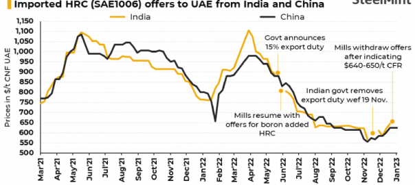 Imported Chinese HRC offers to the UAE stood unchanged at $620-630/t CFR this week as market participants are yet to come back from the New Year holidays. Also, HRC offers from India were heard at around $650/t CFR. The market will be more clear by next week, sources highlighted.