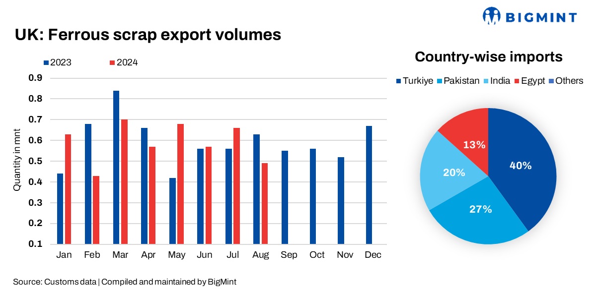 • UK’s ferrous scrap exports fell 26% m-o-m to 494,966 t in Aug’24 from 660,760 t in Jul’24. Exports fell 22% y-o-y from 632,777 t in Aug’23.