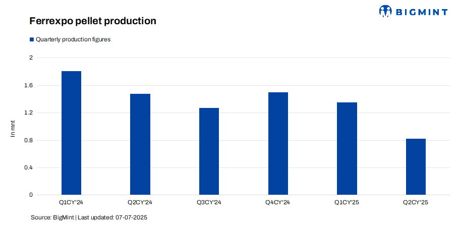 • Ukraine’s Ferrexpo, a leading producer and exporter of pellets, recorded pellet output of 821,882 t in Q2CY’25, down 39% q-o-q compared to 1.35 mnt in Q1CY’25 due to reduced liquidity caused by suspended VAT refunds. The company downscaled its operations from one pelletising line and lowered high-grade concentrate output.