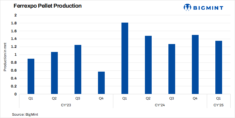 - Ukraine’s Ferrexpo recorded pellet output of 1.35 mnt in Q1CY’25, down 10% from 1.5 mnt in Q4CY’24. The decline was driven by suspension of VAT refunds, which constrained liquidity, and elevated input costs that limited full-scale operations.