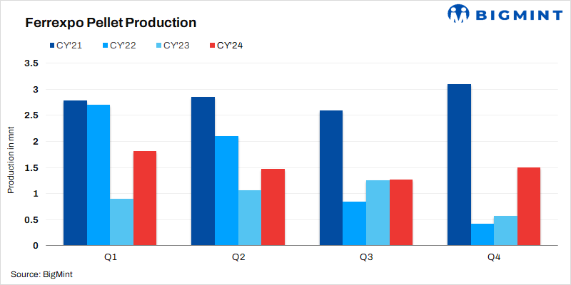 - Ukraine’s Ferrexpo, one of the world’s leading pellet producers and exporters, recorded pellet output of 1.50 mnt in Q4CY’24, an increase of 18% compared to 1.3 mnt in Q3CY’24. This growth was driven by the successful operation of two out of four pelletising lines, despite challenges related to energy grid disruptions.
