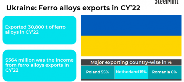 Ukraine exported 0.349 mnt of ferro alloys in calendar year 2022 (CY22), a declined of 48% compared to last year. Ukraine’s international trade in iron and steel has been negatively impacted by the war in Ukraine. Due to the blockade of Ukrainian ports, the conflict caused disruptions in supply and distribution. Domestic companies are being forced to curtail output or shut down due to logistics challenges and sales, sources informed.