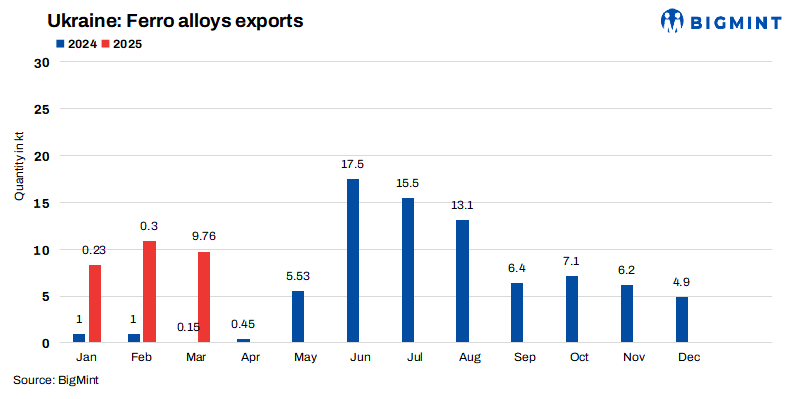 GMK: Ukrainian ferro alloy producers exported 276,800 tonnes (t) of products in the first quarter of 2025 (January-March) — a 52% increase q-o-q. This sharp rise reflected a recovery following the prolonged shutdown of major plants from autumn 2023 through April-May, 2024. A year earlier, Q1 exports stood at just 7,000 t due to the same production downtime, according to GMK Center data sourced from the State Customs Service.