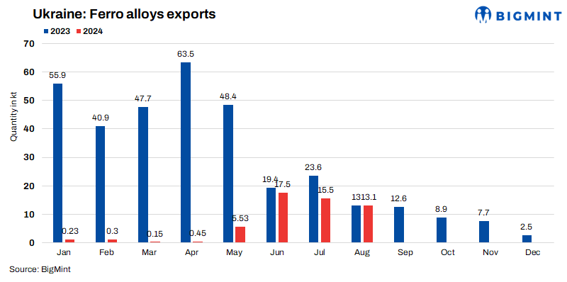 GMK Center: The ferro alloys industry in Ukraine faces a challenging recovery as exports from January to August 2024 dropped by 83.1% y-o-y to only 52,810 tonnes (t) compared to 312,440 t in the same period of 2023. Although the industry is gradually recovering after some capacities were restarted, particularly with the partial reopening of the Zaporizhzhia Ferroalloy Plant (ZFP) in May, it is still far from pre-crisis levels.