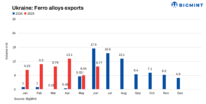 Ukraine’s ferro alloys sector showed strong signs of recovery after a turbulent 2024, driven by renewed export demand and the resumption of production. According to GMK Center data based on customs figures, ferro alloy exports totaled 54,800 t between January and June 2025- up 126.3% y-o-y. Key markets included Algeria, Poland, and Turkey, signaling improving trade flows and growing international interest in Ukrainian ferro alloy products.