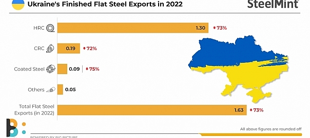 Ukraine’s flat rolled steel exports plunged 73% y-o-y to 1.63 million tonnes (mnt) in calendar year (CY) 2022. Exports fell by 73.5% y-o-y to $1.35 billion. In December 2022, flat rolled steel exports stood at 44,710 tonnes (t), down 16.9% m-o-m and 92.9% y-o-y.