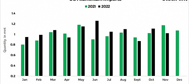 Imports of aluminium products by the US were recorded at 1.02 million tonnes (mnt) in November 2022, down 8% m-o-m from 1.11 mnt in October. Out of total imports, ore/concentrates stood at 472,729 t (down 8%), semi-finished products at 276,354 t (down 21%), finished products at 173,176 t (down 11%), and scrap at 94,106 t (up sharply by 86%).