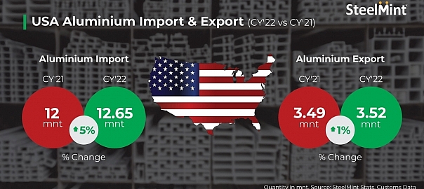 Imports of aluminium by the US were recorded at 12.65 million tonnes (mnt) in calendar year 2022 (CY’22) against 12 mnt in CY’21, up 5% y-o-y. Exports by the US, on the other hand, stood at 3.52 mnt in CY’22, an increase of 1% compared to 3.49 mnt in CY’21.