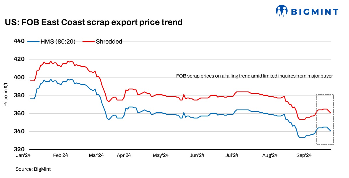 - BigMint’s assessment for HMS (80:20) bulk FOB East Coast decreased by $2/t w-o-w to $341/t on Friday from $343/t a week ago.