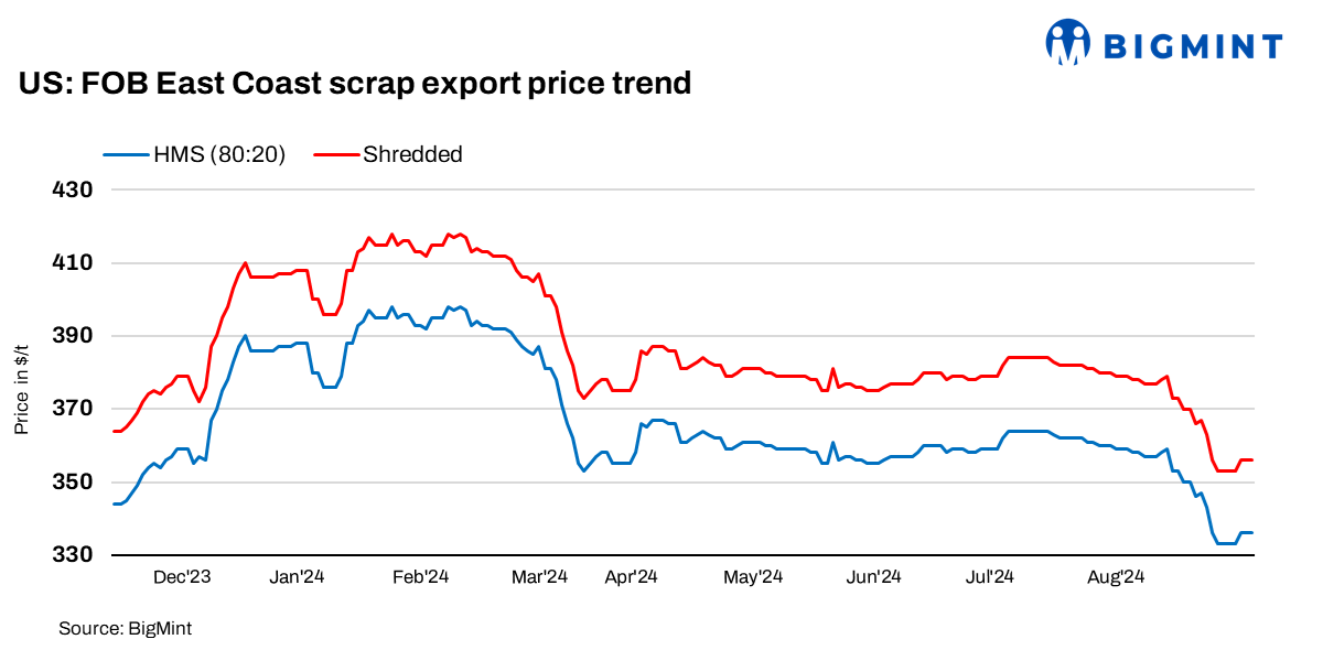 BigMint’s assessment for HMS (80:20) bulk FOB East Coast increased by $3/t w-o-w to $336/t on Friday, up from $333/t a week ago