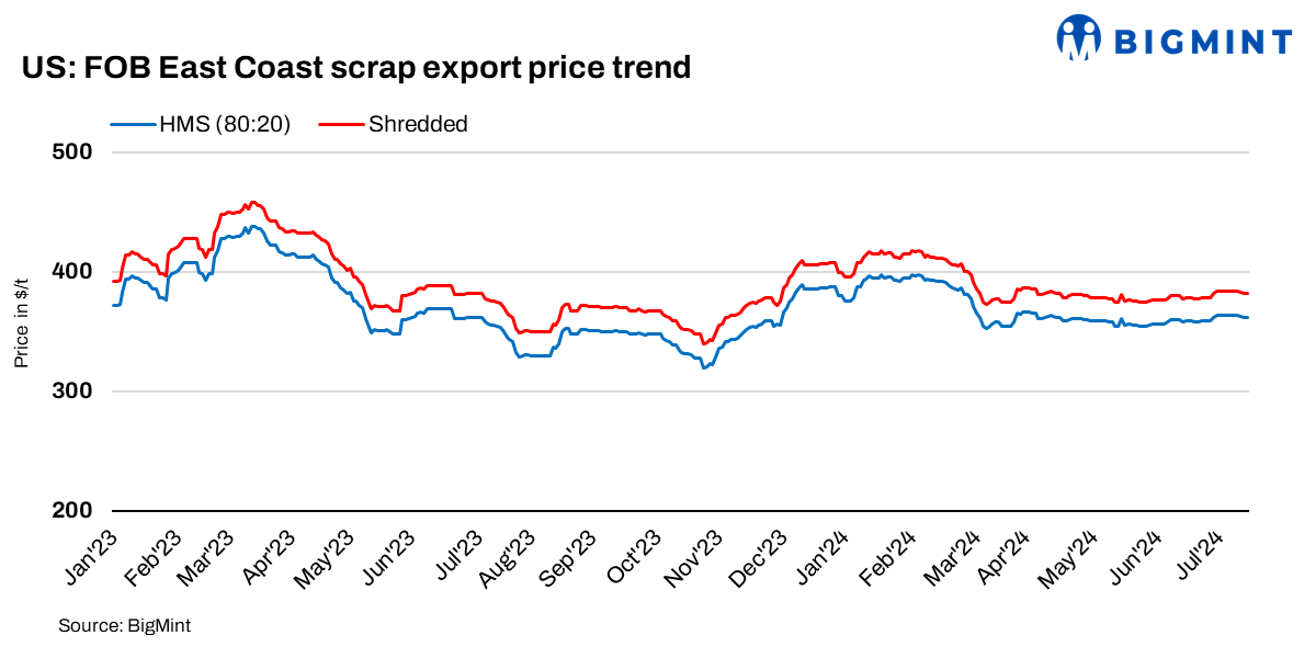 US ferrous scrap export prices held steady from June amid better export volumes and reduced scrap collection activity limiting supply. Despite ongoing weakness in the domestic flat-rolled steel market, there were no initial bids from steelmakers to lower old scrap prices.