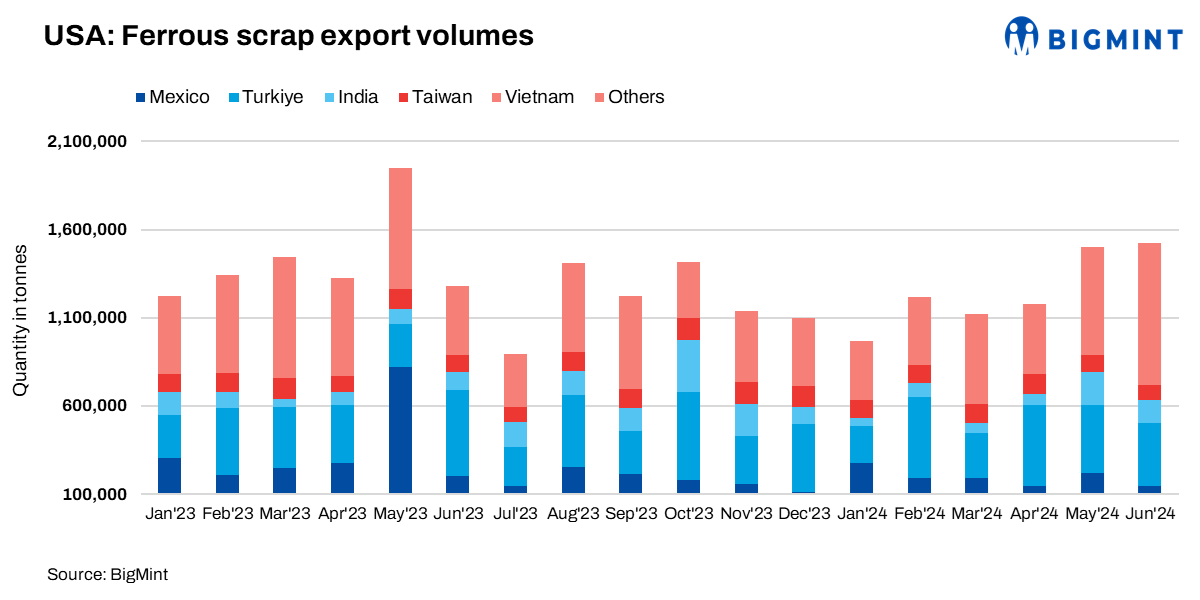 Exports to India: In H1, US ferrous scrap exports to India increased by 8% y-o-y totalling 0.56 mnt compared to 0.52 mnt in H1’CY23. However, June saw a notable 32% m-o-m decline, with exports falling from 0.19 mnt in May to 0.13 mnt. Despite this drop, June’s exports were up over 30% y-o-y from 0.10 mnt in June 2023. The rise in exports earlier in the year was driven by strong demand from Indian steel mills, which secured bulk scrap vessels from the US West Coast at competitive prices.