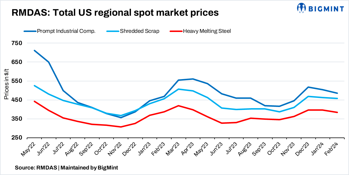 The RMDAS ferrous scrap index, which reflects the US spot market prices for steel mills and foundries, continued to drop in Feb’24. The index witnessed the price declines of the following: