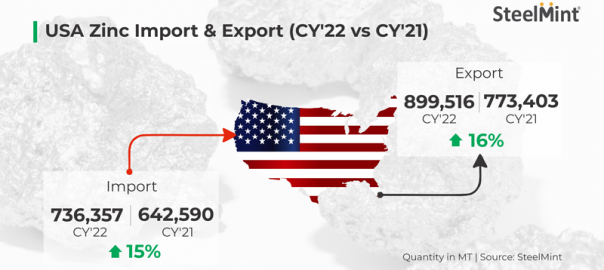 US’ imports of zinc were recorded at 736,357 tonnes (t) in 2022 (CY’22) against 642,590 t, an increase of 15% from CY’21. Zinc exports volumes from the US stood at 899,516 t in CY’22, an increase of 16% compared to 773,403 t in 2021.