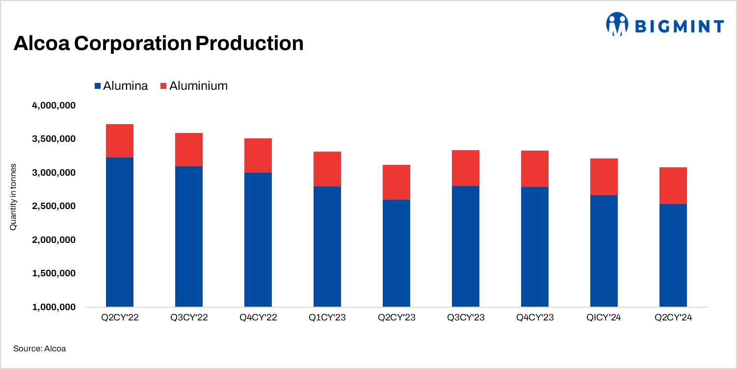 Alcoa Corporation reported results for the second quarter of 2024. Alumina production decreased by 5% to 2.53 mnt, mainly due to the full curtailment of the Kwinana refinery in June 2024. Meanwhile, Alcoa’s aluminum production rose to 543,000 t, marking the seventh consecutive quarter of growth. Alcoa expects 2024 total aluminium segment production and shipments to remain unchanged from the prior projection, ranging between 2.2 and 2.3 mnt, and between 2.5 and 2.6 mnt, respectively.