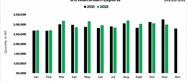 - USA’s aluminium exports stood at 299,135 t in Nov’22, a marginal decrease of 2% m-o-m from 305,115 t in Oct’22.