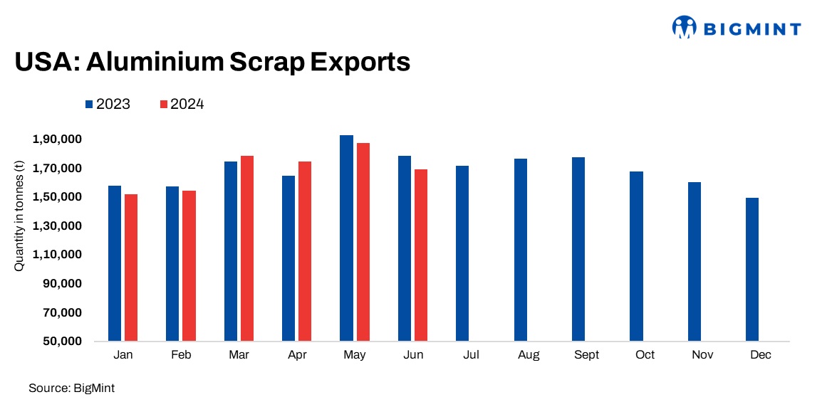 On a y-o-y basis, the export figures for the first half of 2024 (H1CY’24) also showed a slight decrease. From January to June 2024, the U.S. exported 1,015,395 t of aluminium scrap, a 0.91% drop from 1,024,700 t exported during the same period in 2023. Though modest, this y-o-y decline indicated a sustained trend that could be influenced by various factors, including global economic conditions.