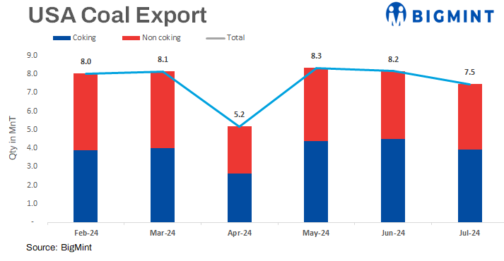 The US’ coal exports stood at 7.5 mnt in Jul’24, down by 9% against 8.2 mnt in Jun’24 according to data maintained by BigMint. The US’ thermal coal exports stood at 3.5 mnt whereas coking coal exports stood at 3.9 mnt in Jul’24. India remained its top coking coal importer followed by the Netherlands and Brazil in this period.