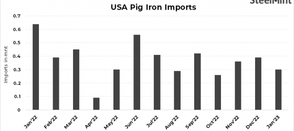 - The USA’s pig iron imports dropped by 25% m-o-m to 297,010 t in Jan’23 from 395,018 t in Dec’22, as per data recently released by Customs.