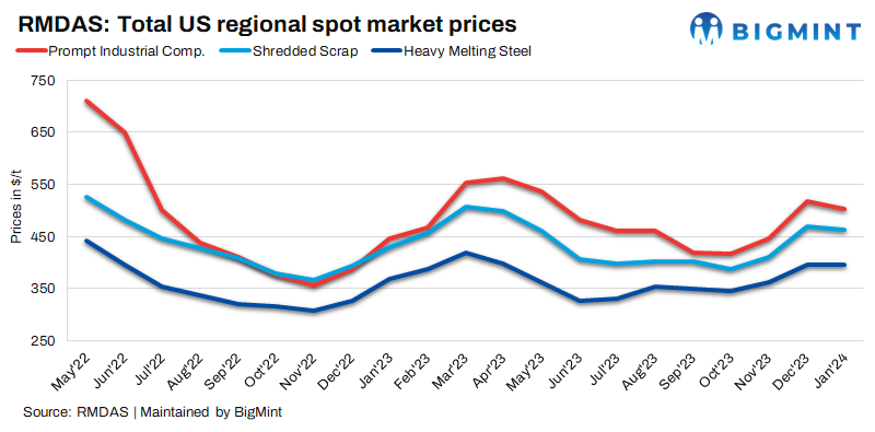 The RMDAS ferrous scrap index, which reflects the US spot market prices for steel mills and foundries, has dropped in Jan’24. The index witnessed the following drops: