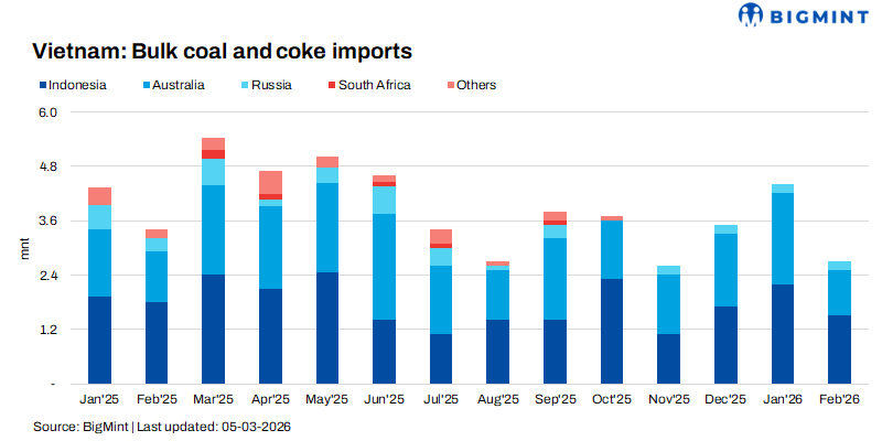 Vietnam’s bulk imports of coal and coke declined 38.6% m-o-m and 20.6% y-o-y to 2.7 mnt in Feb’26, largely reflecting slower industrial activity following the Lunar New Year holidays and adequate inventories. Indonesia remained the leading supplier at 1.5 mnt (-31.8% m-o-m), followed by Australia with 1 mnt (-50% m-o-m), while imports from Russia were stable at 0.2 mnt.