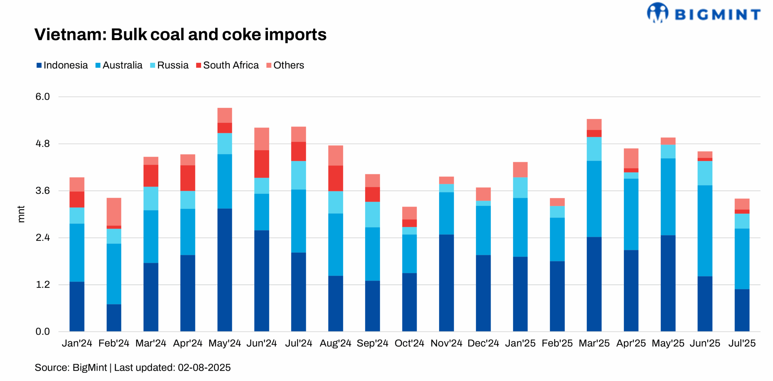 Vietnam’s bulk coal and coke imports (coking, non-coking, and met coke) reached 3.4 mnt in Jul’25, marking a 26.1% m-o-m fall from 4.6 mnt in Jun’25 and a 35% y-o-y drop from 5.2 mnt in Jul’24. Australia remained the leading supplier, exporting 1.54 mnt, down 33.3% m-o-m, followed by Indonesia at 1.09 mnt, down 23% m-o-m.