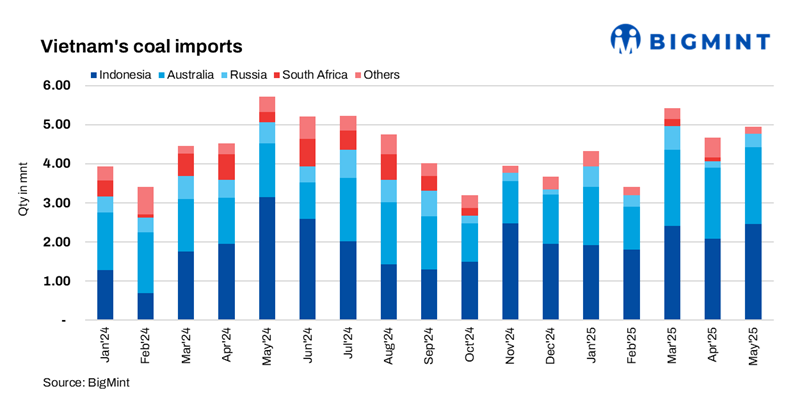 Vietnam’s bulk coal and coke imports (coking, non-coking, and met coke) reached 5 million tonnes (mnt) in May’25, marking a 5.9% m-o-m rise from 4.7 mnt in April, but a 13.3% drop from 5.7 mnt in May’24. Indonesia remained the leading supplier, exporting 2.5 mnt, up 18.3% m-o-m, followed by Australia at 2 mnt, up 7.4% m-o-m.