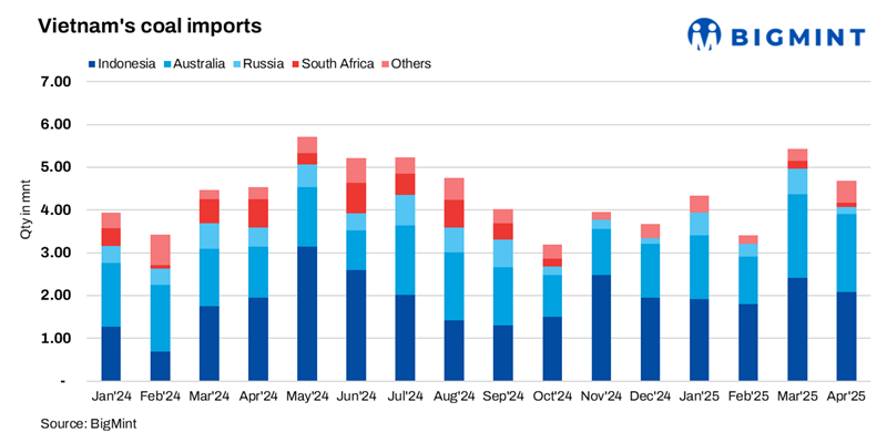 Vietnam’s bulk coal imports (coking, non-coking, and met coke) reached 4.7 mnt in Apr’25, a 13.8% decrease from 5.4 mnt in March, and a 3.3% rise from 4.5 mnt in Apr’24. Indonesia was the leading supplier, exporting 2.1 mnt, down 13.7% m-o-m, followed by Australia at 1.8 mnt, down 6.5% m-o-m.