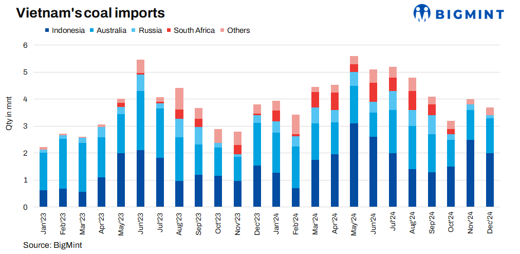 In Dec’24, Vietnam’s bulk coal imports, including coking, non-coking and met coke, decreased by 7% to 3.7 mnt from 4 mnt in Nov’24. Additionally, the import volume in Dec’24 marks a 3% decline from 3.8 mnt in Dec’23. Indonesia continued to be the leading supplier, contributing 2 mnt, followed by Australia at 1.3 mnt. For CY’24, Vietnam’s total coal imports amounted to 52.1 mnt, a 27% increase from 41.1 mnt in CY’23.