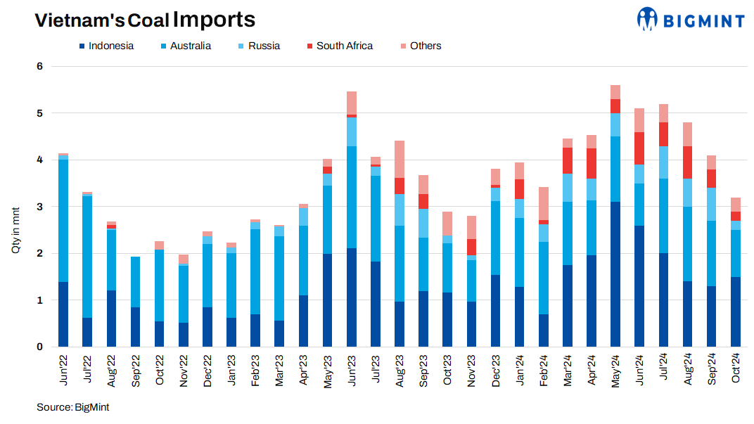 Vietnam’s bulk coal (coking, non-coking, and met coke) imports declined by 20% in Oct’24 to 3.2 mnt from 4.0 mnt in Sep’24. However, imports in Oct’24 were 9% higher than 2.9 mnt in Oct’23.