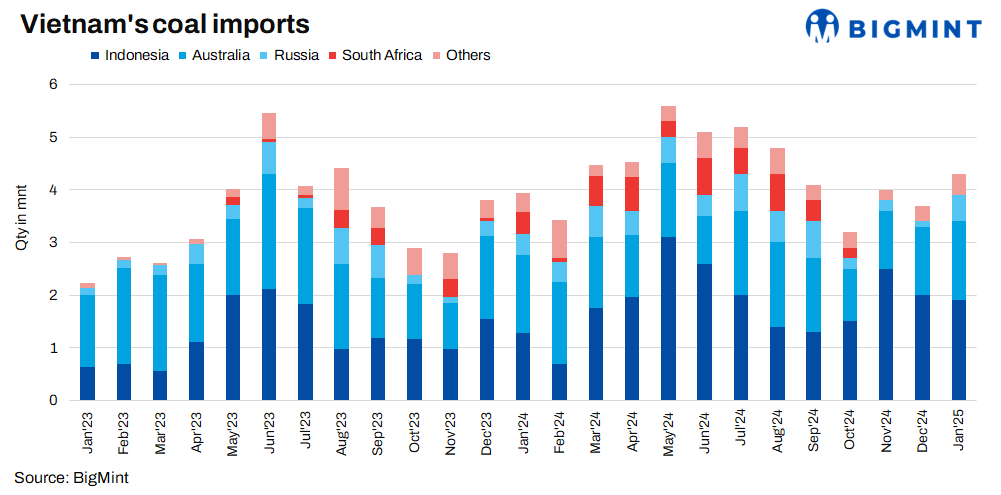 Vietnam’s bulk coal imports (including coking, non-coking, and met coke) climbed up by 16% in Jan’25 to 4.3 mnt from 3.7 mnt in Dec’24. Additionally, imports increased by 10% compared to 3.9 mnt in Jan’24. Indonesia continued to be the top supplier, providing 1.9 mnt, followed by Australia at 1.5 mnt.