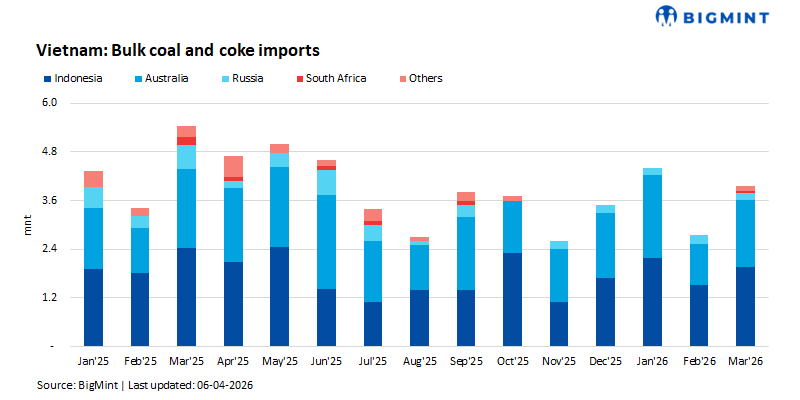 Vietnam’s bulk coal imports rose 44.5% m-o-m to 3.97 mnt in Mar’26, but declined 26.5% y-o-y, reflecting uneven demand recovery. Indonesia remained the top supplier at 2 mnt, up 30% m-o-m, followed by Australia at 1.65 mnt (+63%). Conversely, imports from Russia declined by 19% m-o-m at 0.18 mnt. Overall, Q1 2026 (Jan-Mar) imports declined 15% y-o-y to 11.1 mnt, reflecting subdued consumption.
